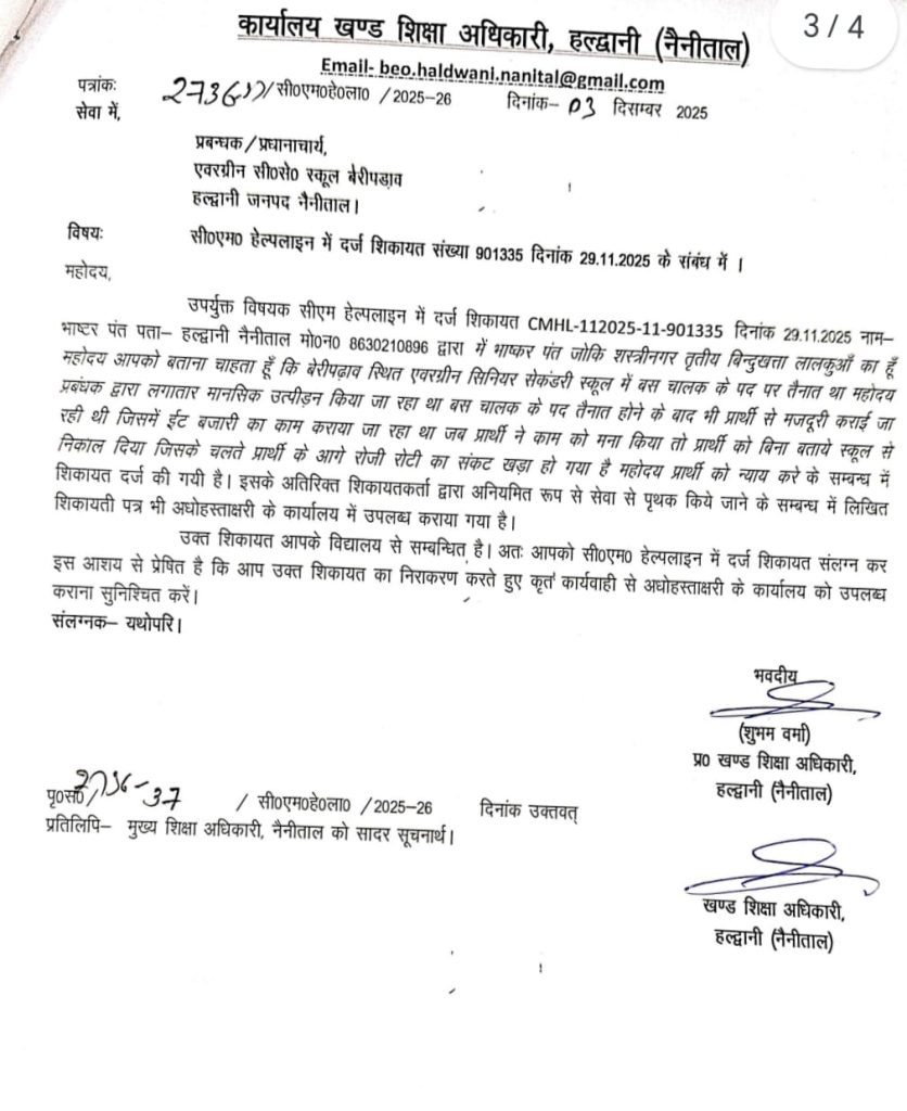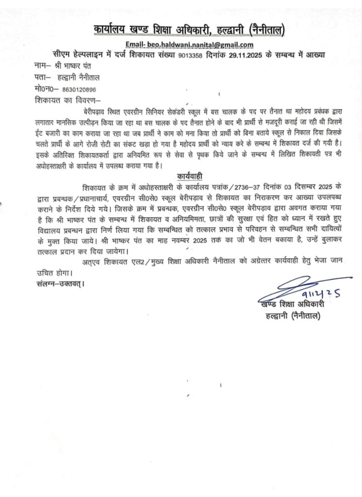 लालकुआं न्यूज़- बेरीपड़ाव स्थित एवरग्रीन सीनियर सेकेंडरी स्कूल में तैनात बस चालक भाष्कर पंत ने मानसिक उत्पीड़न, मजदूरी कराए जाने और बिना सूचना सेवा से पृथक किए जाने की शिकायत सीएम हेल्पलाइन (शिकायत संख्या 9013358) में दर्ज कराई थी।
