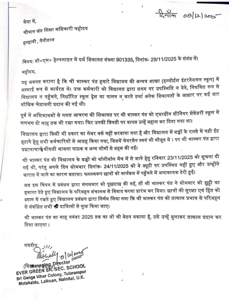 शिकायत के बाद खंड शिक्षा अधिकारी, हल्द्वानी ने 3 दिसंबर 2025 (पत्रांक 2736-37) को स्कूल प्रबंधन और प्रधानाचार्य से आख्या मांगी। जवाब में प्रबंधन ने कहा कि विद्यार्थियों की सुरक्षा को देखते हुए भाष्कर पंत को परिवहन दायित्वों से तत्काल प्रभाव से मुक्त किया गया है। साथ ही बताया कि उन्हें नवंबर 2025 तक का बकाया वेतन भुगतान के लिए बुलाया गया है। मामले की जांच आख्या और पूरा प्रकरण अब मुख्य शिक्षा अधिकारी, नैनीताल को अग्रेतर कार्रवाई के लिए भेज दिया गया है।
