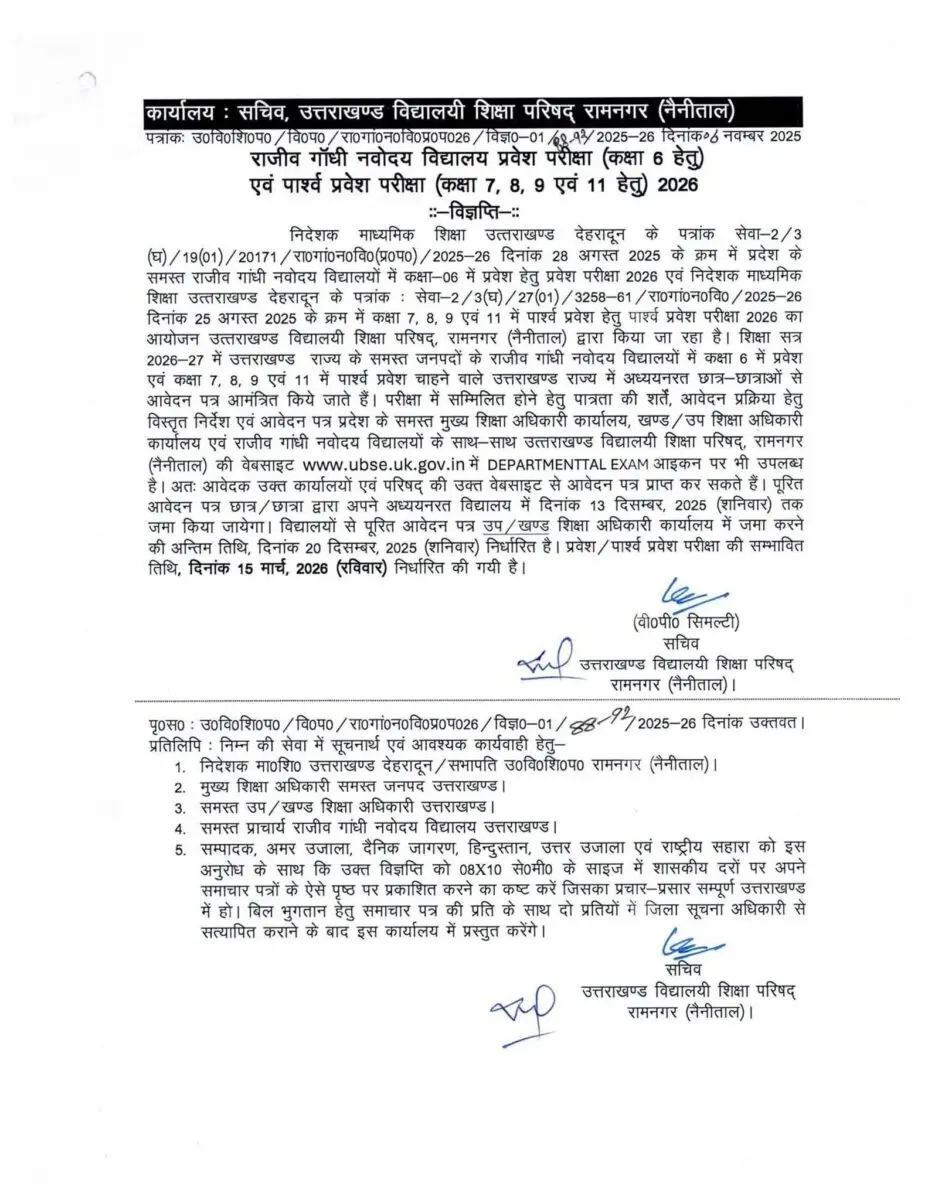 कक्षा 6 में प्रवेश के लिए प्रवेश परीक्षा 2026 तथा कक्षा 7, 8, 9 एवं 11 में पार्श्व प्रवेश परीक्षा 2026 का आयोजन उत्तराखण्ड विद्यालयी शिक्षा परिषद, रामनगर (नैनीताल) द्वारा किया जाएगा।