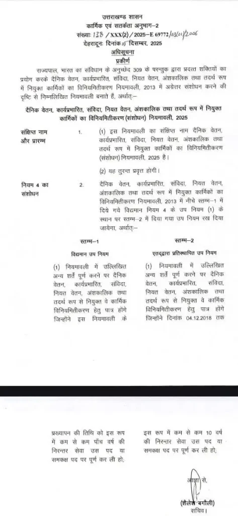 देहरादून न्यूज़- राज्य सरकार ने कार्मिकों के हित में एक महत्वपूर्ण कदम उठाते हुए विनियमितीकरण नियमावली-2013 में संशोधन कर नई विनियमितीकरण (संशोधन) नियमावली-2025 जारी कर दी है। इस संबंध में अधिसूचना आज कार्मिक सचिव शैलेश बगौली द्वारा निर्गत की गई।
