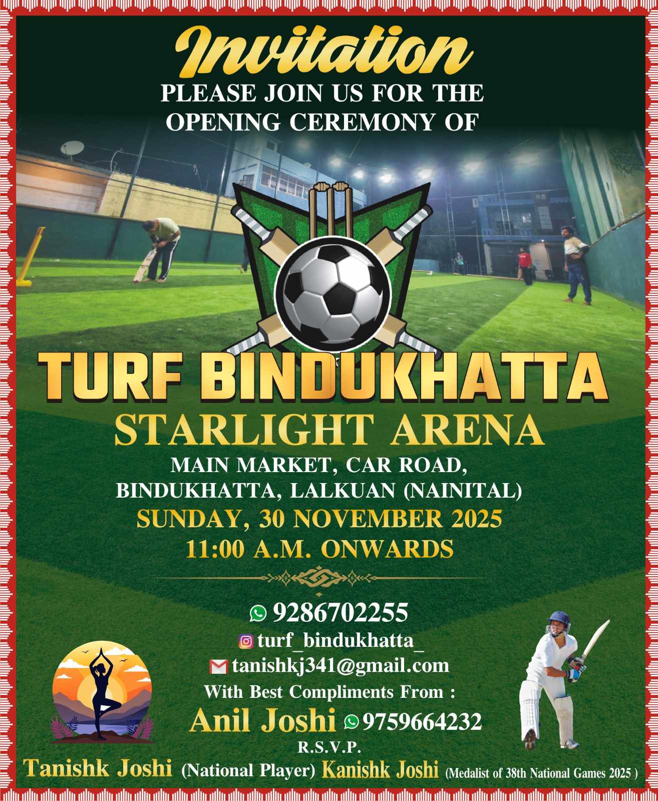 स्पोर्ट्स प्रेमियों के लिए बड़ी खबर ‘टर्फ बिंदुखत्ता स्टारलाइट एरीना’ का 30 नवंबर को होगा उद्घाटन