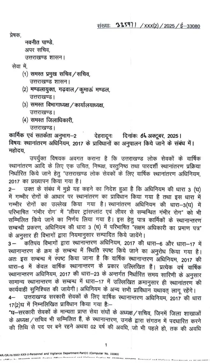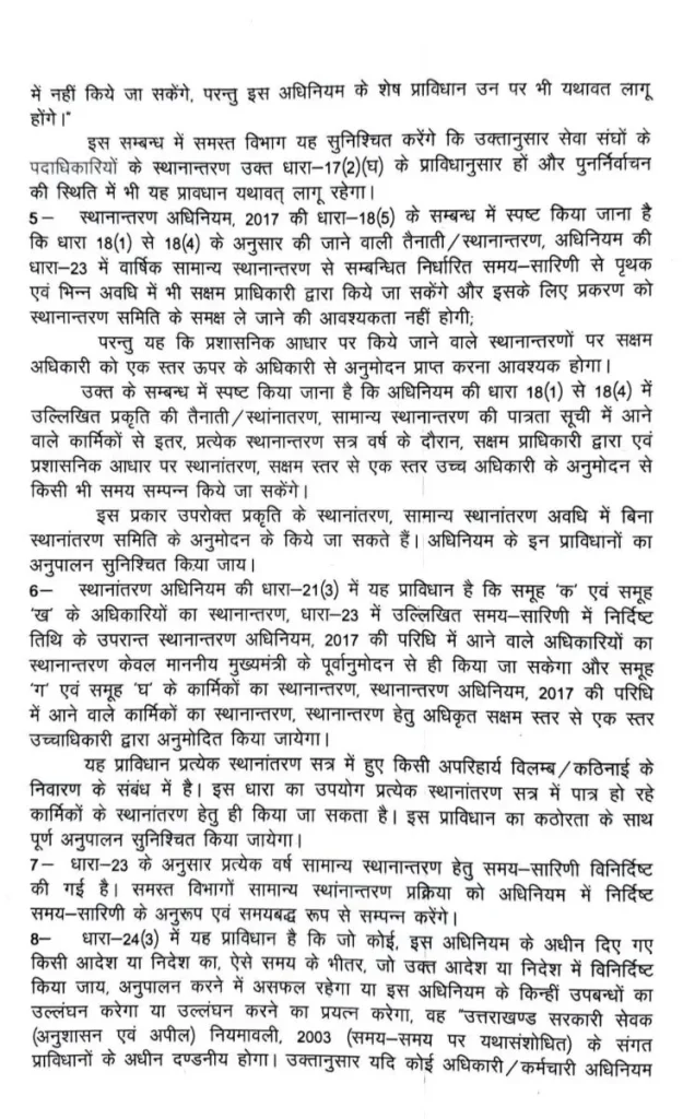 उत्तराखण्ड सरकार ने स्थानांतरण अधिनियम, 2017 के प्राविधानों के अनुपालन पर दिया जोर