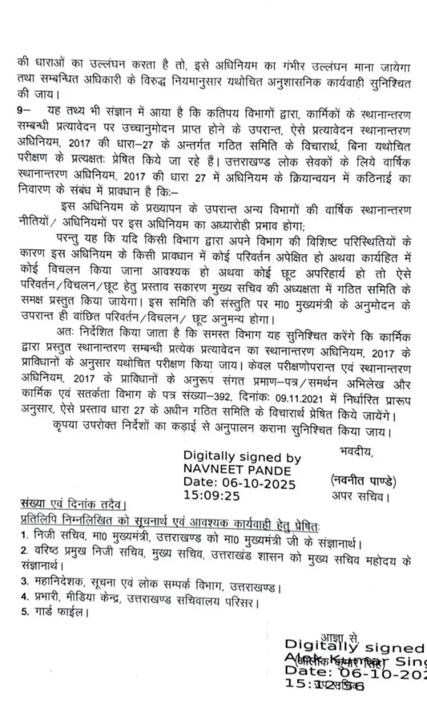 सूत्रों के अनुसार, कार्मिक विभाग ने सभी विभागाध्यक्षों को अधिनियम की धाराओं का पालन करते हुए स्थानांतरण प्रस्ताव तैयार करने और उसकी स्वीकृति से पूर्व सभी औपचारिकताओं का संज्ञान लेने को कहा है। शासन का मानना है कि इससे पारदर्शिता, जवाबदेही और सुशासन को बल मिलेगा।