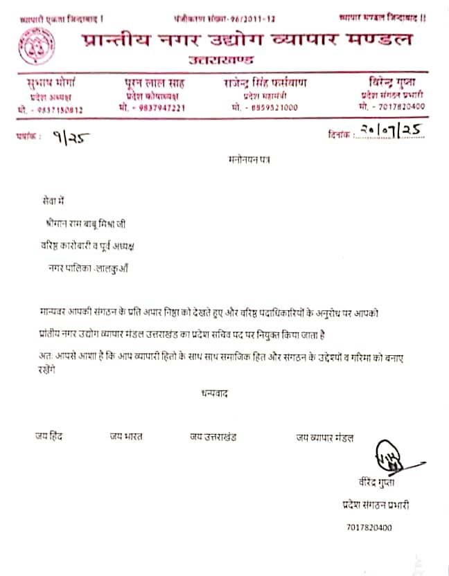 प्रांतीय उद्योग व्यापार मंडल ने संगठन का विस्तार करते हुए लालकुआं के पूर्व नगर पंचायत अध्यक्ष और उद्योगपति रामबाबू मिश्रा को संगठन का प्रदेश सचिव नियुक्त किया है।