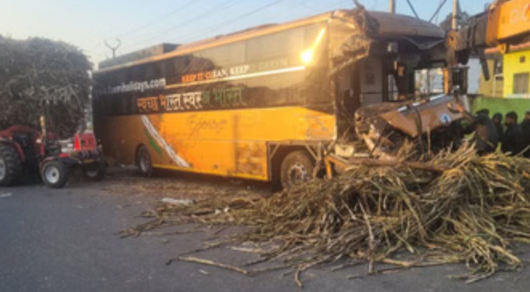 देहरादून-हरिद्वार हाईवे पर बड़ा हादसा: वॉल्वो बस गन्ने से भरे ट्रैक्टर-ट्राले से टकराई, चालक की मौत—परिचालक घायल