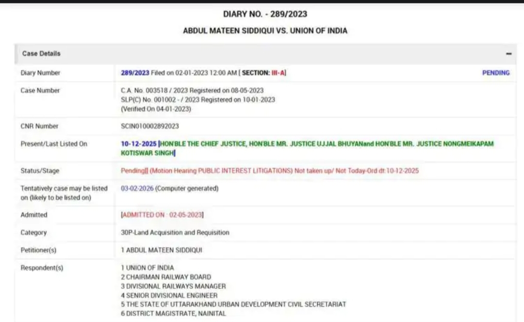 हल्द्वानी के बहुचर्चित बनभूलपुरा रेलवे भूमि अतिक्रमण प्रकरण की सुनवाई एक बार फिर आगे खिसक गई है। सुप्रीम कोर्ट की अधिकृत वेबसाइट के अनुसार अब इस मामले की संभावित सुनवाई 3 फरवरी 2026 को दर्शाई गई है। इससे पहले इस प्रकरण में 16 दिसंबर 2025 को संभावित सुनवाई की तारीख तय मानी जा रही थी।
