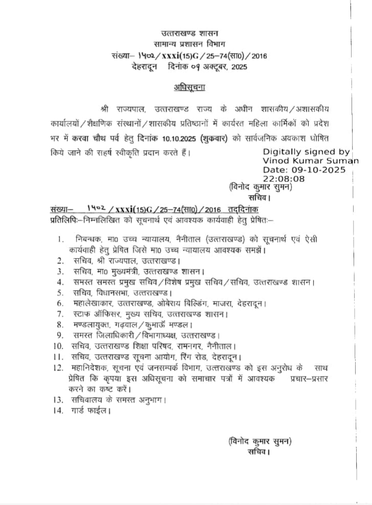 देहरादून न्यूज़- उत्तराखंड की महिलाओं के लिए खुशखबरी है। राज्यपाल की स्वीकृति के बाद प्रदेश सरकार ने करवा चौथ पर्व के अवसर पर 10 अक्टूबर 2025 (शुक्रवार) को महिला कर्मचारियों के लिए अवकाश घोषित कर दिया है।