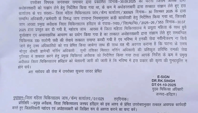हरिद्वार न्यूज़- धर्मनगरी हरिद्वार से इंसानियत को शर्मसार कर देने वाला मामला सामने आया है। महिला अस्पताल में गर्भवती महिला के साथ अमानवीय व्यवहार करने पर स्वास्थ्य विभाग ने बड़ी कार्रवाई की है। महिला चिकित्साधिकारी डॉ. सलोनी पंथी की सेवाएं तत्काल प्रभाव से समाप्त कर दी गई हैं। वहीं लापरवाह नर्सिंग स्टाफ पर भी विभागीय कार्रवाई की गई है।